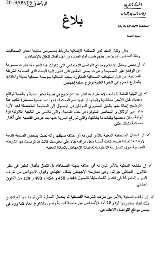 يعلن وكيل الملك لدى المحكمة الابتدائية بالرباط بخصوص متابعة إحدى الصحافيات رفقة أشخاص آخرين، من بينهم طبيب أمام القضاء من أجل أفعال تتعلق بالإجهاض: