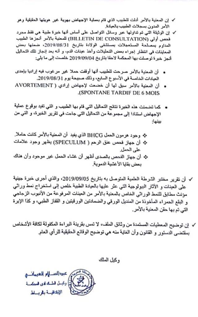 -إن الوثيقة التي تم تداولها عبر وسائل التواصل على أساس أنها خبرة طبية هي فقط مجرد فحص أولي (Bulletin de consultation) للمعنية بالأمر أنجزها الطبيب المداوم بمصلحة المستعجلات بمستشفي الولادة بتاريخ 31/08/2019 ضمنها بعض المعاينات في انتظار إجراء بعض التحليلات وأخذ عينات الدم. وأنه بعد القيام بتلك التحاليل، أنجز خبرة توصلت بها المحكمة لاحقا بتاريخ 04/09/2019 خلصت إلى ما يلي: