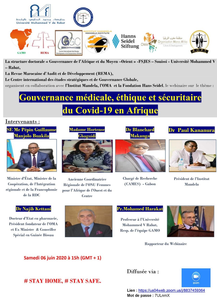 عقدت بنية البحث في الدكتوراه ” الحكامة في إفريقيا والشرق الأوسط التي يشرف عليها الأستاذ محمد حركات – جامعة محمد الخامس – كلية العلوم القانونية والاقتصادية والاجتماعية – السويسي بشراكة مع المجلة المغربية للتدقيق والتنمية والمركز الدولي للدراسات الإستراتيجية والحكامة العامة، وبتعاون مع مؤسسة مانديلا ومنظمة مغرب إفريقيا للثقافة والتنمية والمؤسسة الألمانية هانس سايدل، -عقدت- اليوم السبت 06 يونيو 2020 ندوة دولية عبر تقنية المناظرة المرئية استضافت خلالها ثلة من الخبراء الأفارقة الذين تداولوا حول الحكامة الطبية، الأخلاقية والأمنية لكوفيد-19 بإفريقيا.