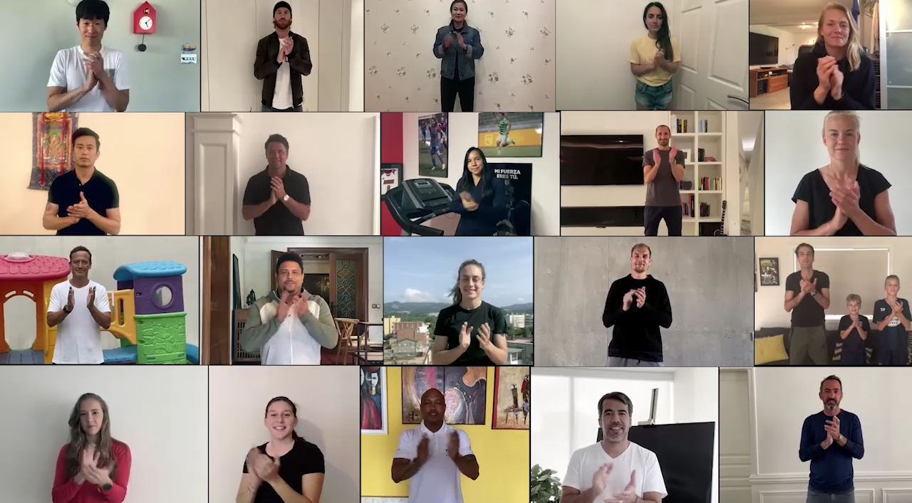 في هذا الفيديو الفريد من نوعه، يقوم نجوم كرة القدم العالميين المشهورين من الذكور والإناث، بما في ذلك بيليه، دييغو مارادونا، رونالدو، ديفيد بيكهام، كاكا، مارتا، ماركو فان باستن، زين الدين زيدان، بارك جي سونغ، يايا توريه، لوسي برونز، صمويل إيتو، فابيو كانافارو وغيرهم كثيرون بالتصفيق الحار للعاملين في مجال الرعاية الصحية تقديراً لعملهم في مساعدة المواطنين وتضحياتهم لوقف مخاطر انتشار الفيروس.