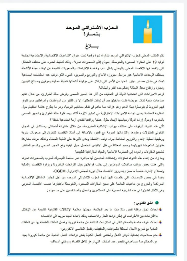 نظم المكتب المحلي للحزب الاشتراكي الموحد بتمارة، ندوة رقمية تحت عنوان “التداعيات الاقتصادية والاجتماعية لجائحة كوفيد 19 على المقاولات الصغيرة والمتوسطة_نموذج إقليم الصخيرات تمارة”، وذلك لتسليط الضوء على مختلف المشاكل التي يتخبط فيها الاقتصاد المحلي والوطني بشكل عام، وخاصة الاكراهات والصعوبات الناجمة عن توقف عجلة الأنشطة بمختلف الوحدات الانتاجية عبر مراحل سيرورة الانتاج والتوزيع والتسويق، الشيء الذي ترتب عنه انعكاسات اجتماعية تجلت في فقدان مصادر عيش العديد من الأسر التي ترتكز على مزاولة أنشطتها كطبقة عمالية وحرفيين وصناع تقليديين وتجار، وارتفاع معدل البطالة وتفاقم حدة الفقر والهشاشة.