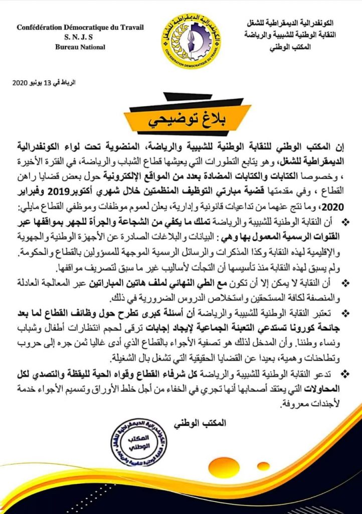 أصدر المكتب الوطني للنقابة الوطنية للشباب والرياضة، المنضوية تحت لواء الكونفدرالية الديمقراطية للشغل، بلاغا توضيحيا بتاريخ 13 يونيه تضمنت فقرته التمهيدية الأولى إشارة إلى متابعته للتطورات “التي يعيشها قطاع الشباب والرياضة في الفترة الأخيرة، وخصوصا الكتابات والكتابات المضادة بعدد من المواقع الإلكترونية حول بعض قضايا راهن القطاع، وفي مقدمتها قضية مبارتي التوظيف خلال شهري أكتوبر 2019 وفبراير 2020، وما نتج عنهما من تداعيات قانونية ودارية.”