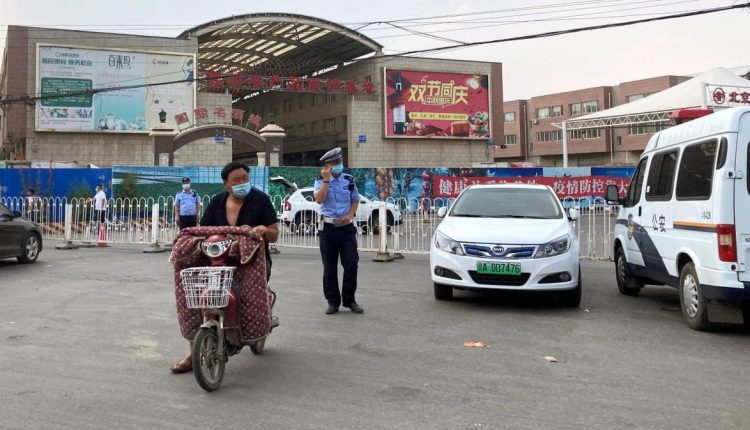 وقف ضباط الشرطة خارج سوق شينفادي، الذي تم إغلاقه بسبب تصاعد حالات كوفيد 19 في 13 يونيو 2020. حدث ذلك بعد شيوع أخبار مقلقة تفيد أنه تم تحديد 57 حالة جديدة مؤكدة من الإصابة بفيروس كورونا خلال 24 ساعة في الصين.