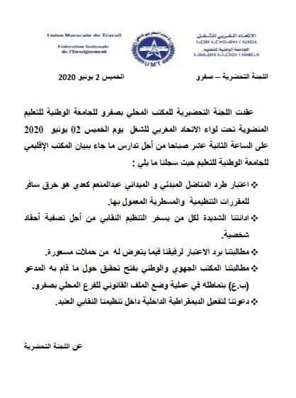من جانب آخر، عقدت اللجنة التحضيرية للمكتب المحلي بصفرو التابع للجامعة الوطنية للتعليم اجتماعا يوم 2 يونيو 2020 من أجل التداول في مضمون بيان المكتب الإقليمي، وأصدرت بيانا مضادا اعتبر فيه أعضاء اللجنة طرد النائب الأول لكاتب الفرع الإقليمي خرقا سافرا للمقررات التنظيمية و المسطرية المعمول بها، كما طالبوا برد الإعتبار لهذا المناضل النقابي بعدما تعرض لحملات همجية على حد قولهم، وبضرورة فتح تحقيق عما قام به بدر عرفات بتماطله في عملية وضع الملف القانوني للفرع المحلي بصفرو.