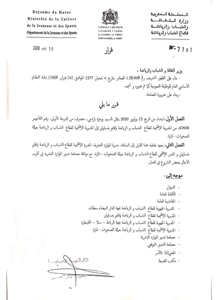 أبى الحسن عبيابة، وزير الثقافة والشباب والرياضة السابق، إلا أن يصدر تزامنا مع فرض خالة الطوارئ الصحية، بتاريخ 17 مارس المنصرم، قرارا بتنقيل بوعزة لمراحي، الكاتب الوطني للنقابة الوطنية للشبيبة والرياضة المنضوية تحت لواء كدش، من مركز الهرهورة إلى المديرية الإقليمية لبنسليمان لأسباب نقابية لها علاقة بمواقفه النضالية، كما عللت النقابة.