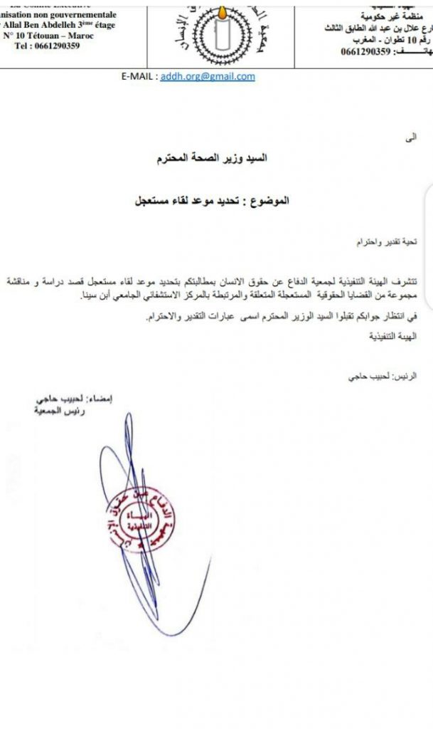 وجه لحبيب حاجي رئيس جمعية الدفاع عن حقوق الإنسان، يومه الجمعة 10 يوليوز، مراسلة إلى السيد آيت الطالب وزير الصحة، في موضوع تحديد لقاء مستعجل بقصد دراسة مجموعة من القضايا الحقوقية بالمركز الاستشفائي الجامعي ابن سينا.