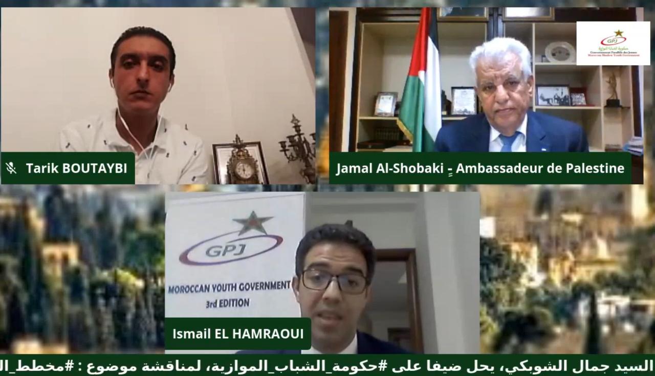 عقدت حكومة الشباب المغربية الموازية، مساء أمس، لقاء رقميا مفتوحا، بمشاركة سفير دولة فلسطين لدى المملكة المغربية، جمال الشوبكي، تحت عنوان، مخطط الضم الإسرائيلي .. الجائحة الكبرى.