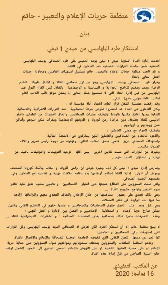 في الأخير، تستنكر حاتم الطرد الذي تعرض له الصحافي المجد يوسف البلهايسي و كل القرارات التي استهدفت باقي الصحافيين و العاملين.