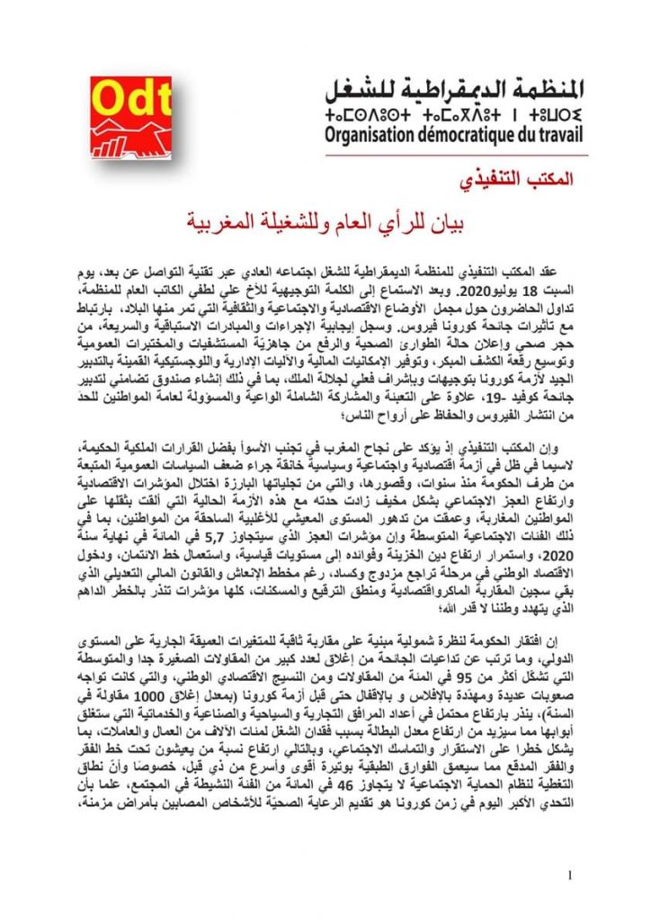 عقد المكتب التنفيذي للمنظمة الديمقراطية للشغل اجتماعه العادي عبر تقنية التواصل عن بعد، يوم السبت 18 يوليو2020. وبعد الاستماع إلى الكلمة التوجيهية للأخ علي لطفي الكاتب العام للمنظمة، تداول الحاضرون حول مجمل الأوضاع الاقتصادية والاجتماعية والثقافية التي تمر منها البلاد، بارتباط مع تأثيرات جائحة كورونا فيروس. وسجل إيجابية الإجراءات والمبادرات الاستباقية والسريعة، من حجر صحي وإعلان حالة الطوارئ الصحية والرفع من جاهزيّة المستشفيات والمختبرات العمومية وتوسيع رقعة الكشف المبكر، وتوفير الإمكانيات المالية والآليات الإدارية واللوجستيكية القمينة بالتدبير الجيد لأزمة كورونا بتوجيهات وبإشراف فعلي لجلالة الملك، بما في ذلك إنشاء صندوق تضامني لتدبير جائحة كوفيد -19، علاوة على التعبئة والمشاركة الشاملة الواعية والمسؤولة لعامة المواطنين للحدَ من انتشار الفيروس والحفاظ على أرواح الناس؛