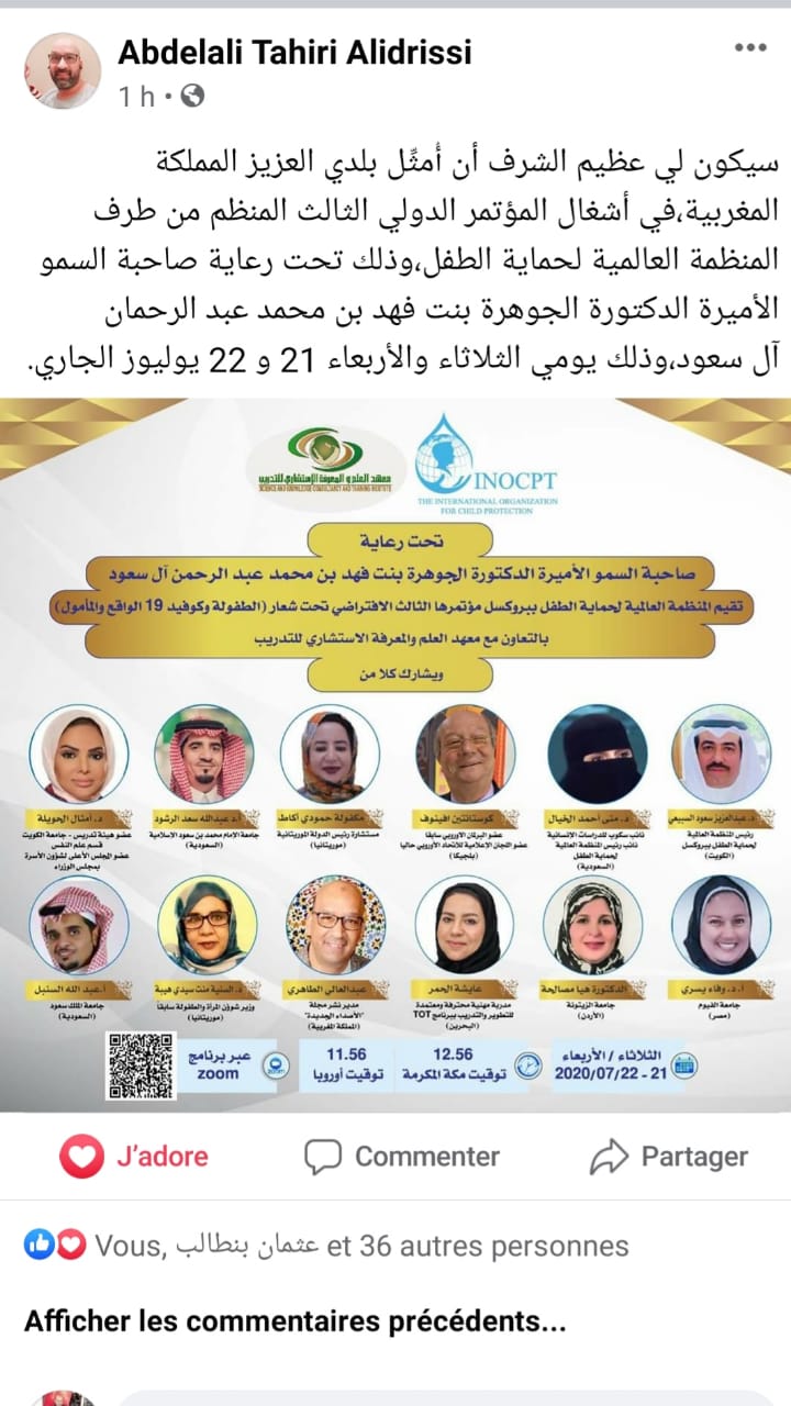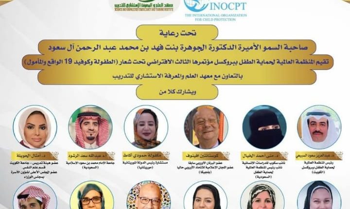 تحت رعاية صاحبة السمو الأميرة الدكتورة الجوهرة بنت فهد بن محمد عبدالرحمان آل سعود ،أقامت المنظمة العالمية لحماية الطفل بالعاصمة البلجيكية بروكسيل وذلك بتعاون مع معهد العلم والمعرفة والاستشاري للتدريب،المؤتمر الدولي الافتراضي الثالث، تحت شعار ” الطفولة وكوفيد 19..الواقع والمأمول”،يومي الثلاثاء والأربعاء 21 و 22 يوليوز 2020.