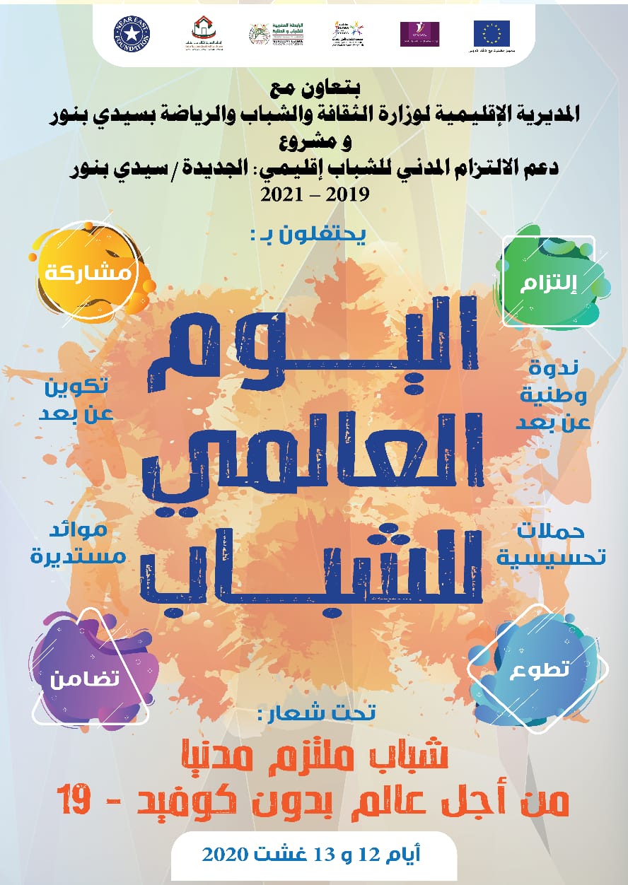 تحت شعار “شباب ملتزم مدنياً من أجل عالم بدون كوفيد – 19” سيحتضن إقليمي الجديدة وسيدي بنور فعاليات الاحتفال باليوم العالمي للشباب وذلك يومي 12 و13 غشت 2020 بتنظيم حملات تحسيسية لفائدة الساكنة المحلية ومجموعة من الندوات والورشات التكوينية عن بعد.