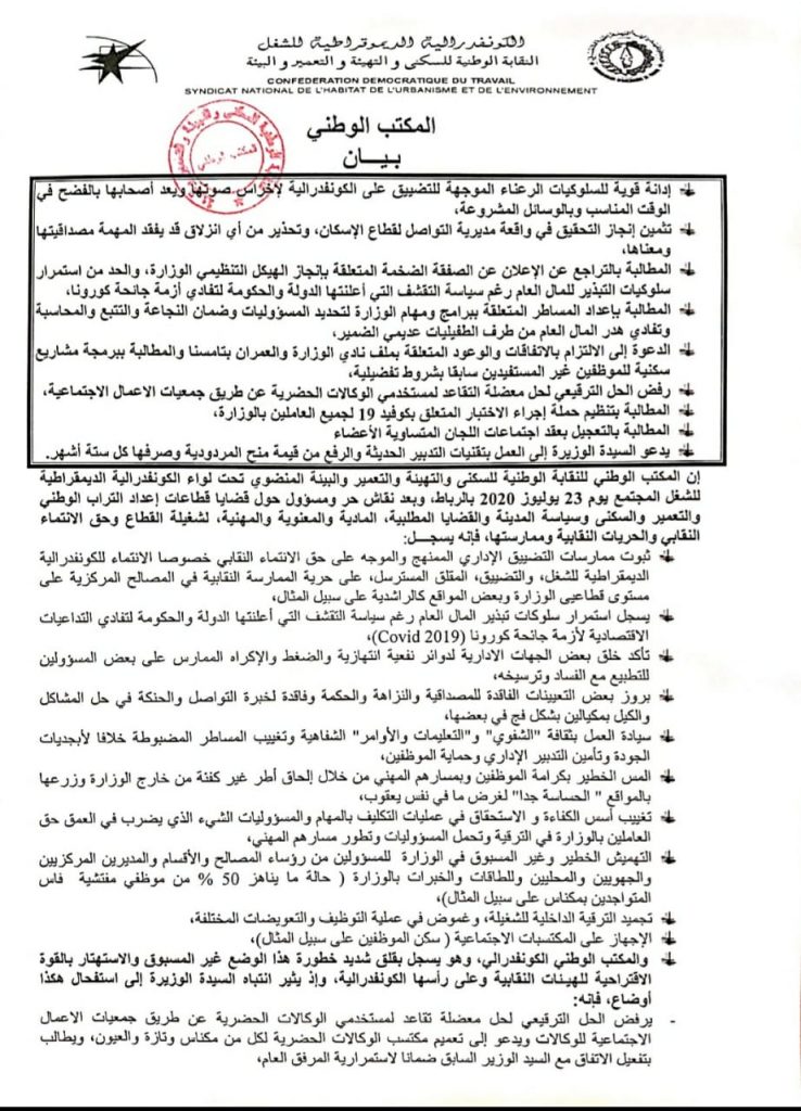 إن المكتب الوطني للنقابة الوطنية للسكنى والتهيئة والتعمير والبيئة المنضوي تحت لواء الكونفدرالية الديمقراطية للشغل المجتمع يوم 23 يوليوز 2020 بالرباط، وبعد نقاش حر ومسؤول حول قضايا قطاعات إعداد التراب الوطني والتعمير والسكنى وسياسة المدينة والقضايا المطلبية، المادية والمعنوية والمهنية، لشغيلة القطاع وحق الانتماء النقابي والحريات النقابية وممارستها، فإنه يسجــــل: