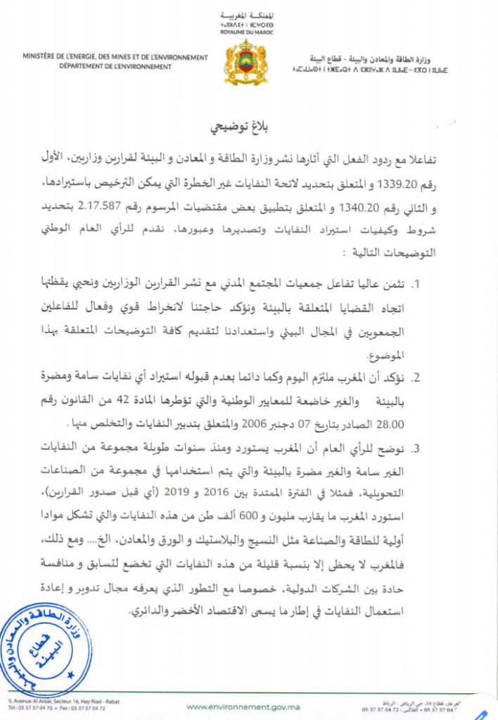 وإذ المغرب ملتزم بعدم قبوله استيراد أي نفايات سامة ومضرة بالبيئة وغير الخاضعة للمعايير الوطنية التي تؤطرها المادة 42 من القانون رقم 28.00 الصادر بتاريخ 07 دجنبر 2006 والمتعلق بتدبير النفايات والتخلص منها. فإنه ومنذ سنوات طويلة؛ حسب ذات البلاغ، قد درج المغرب على استيراد مجموعة من النفايات غير السامة وغير المضرة بالبيئة والتي يتم استخدامها في مجموعة من الصناعات التحويلية.
