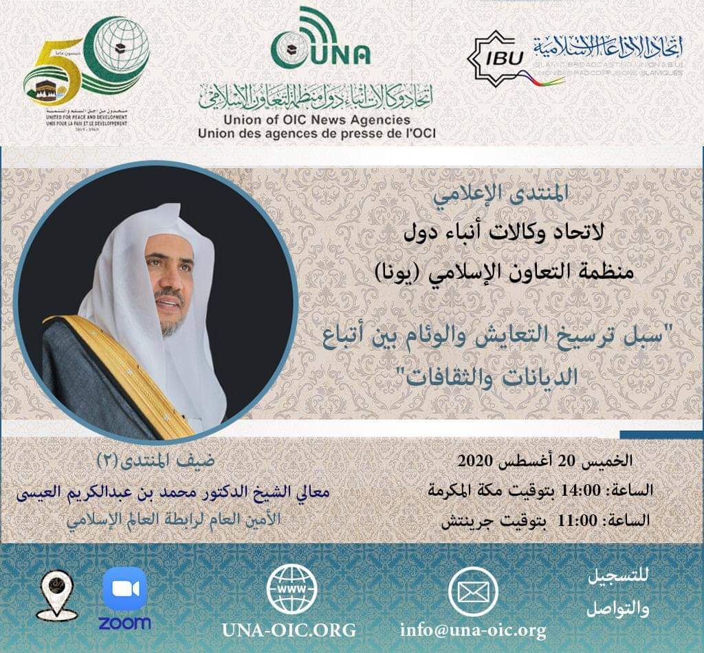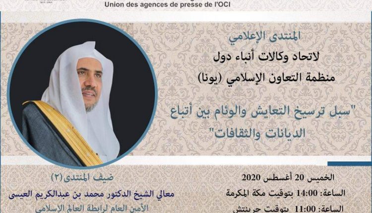 ينظم اتحاد وكالات أنباء دول منظمة التعاون الإسلامي (يونا) يوم غد الخميس (20 أغسطس2020) منتدى إعلاميا افتراضيا (عبر الاتصال المرئي) يستضيف فيه الأمين العام لرابطة العالم الإسلامي الدكتور محمد بن عبد الكريم العيسى للحديث حول تحسين الصورة الذهنية عن الإسلام والمسلمين ومستقبل التعايش بين أتباع الديانات وجهود الرابطة في دعم وترسيخ ذلك.