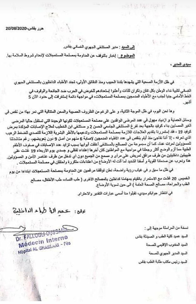 هذا وتجدر الإشارة إلى أن الأطباء الداخليون سيواصلون مهامهم بالمصالح الأخرى: طب النساء، طب الأطفال، مصالح الطب والجراحة، مصالح الصحة العامة، إلى حين تسوية الأوضاع.