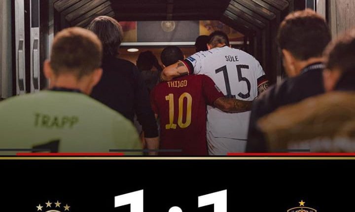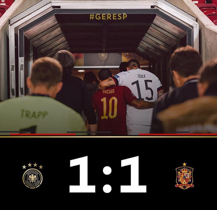 انتهت المباراة التي جمعت بين المنتخبين الالماني والاسباني بالتعادل الايجابي ضمن منافسات المجموعة الرابعة من دوري الامم الاوروبية التي انطلقت مساء اليوم الخميس ,ولقد اضاع كل منهما العديد من الفرص في الشوطين الاول والثاني ,كما عرفت المباراة تالق الحارسين دافيد دي خيا وكيفين تراب اللذان تصديا للعديد من الفرص الخطيرة.