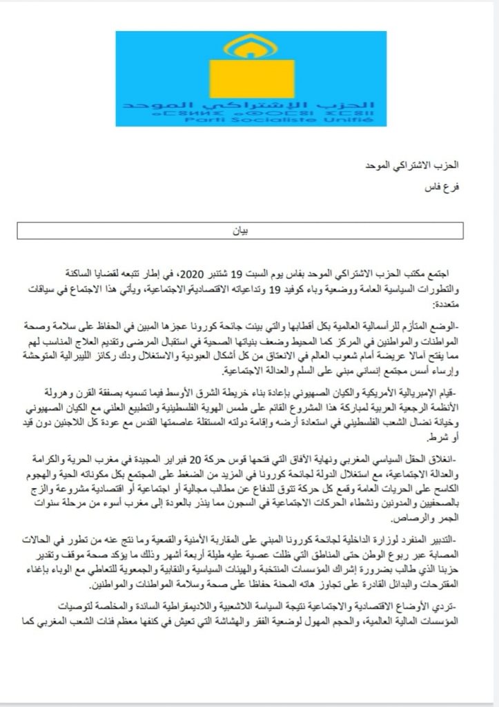 اجتمع مكتب الحزب الاشتراكي الموحد بفاس يوم السبت 19 شتنبر 2020، في إطار تتبعه لقضايا الساكنة والتطورات السياسية العامة ووضعية وباء كوفيد 19 وتداعياته الاقتصادية والاجتماعية، ويأتي هذا الاجتماع في سياقات متعددة: