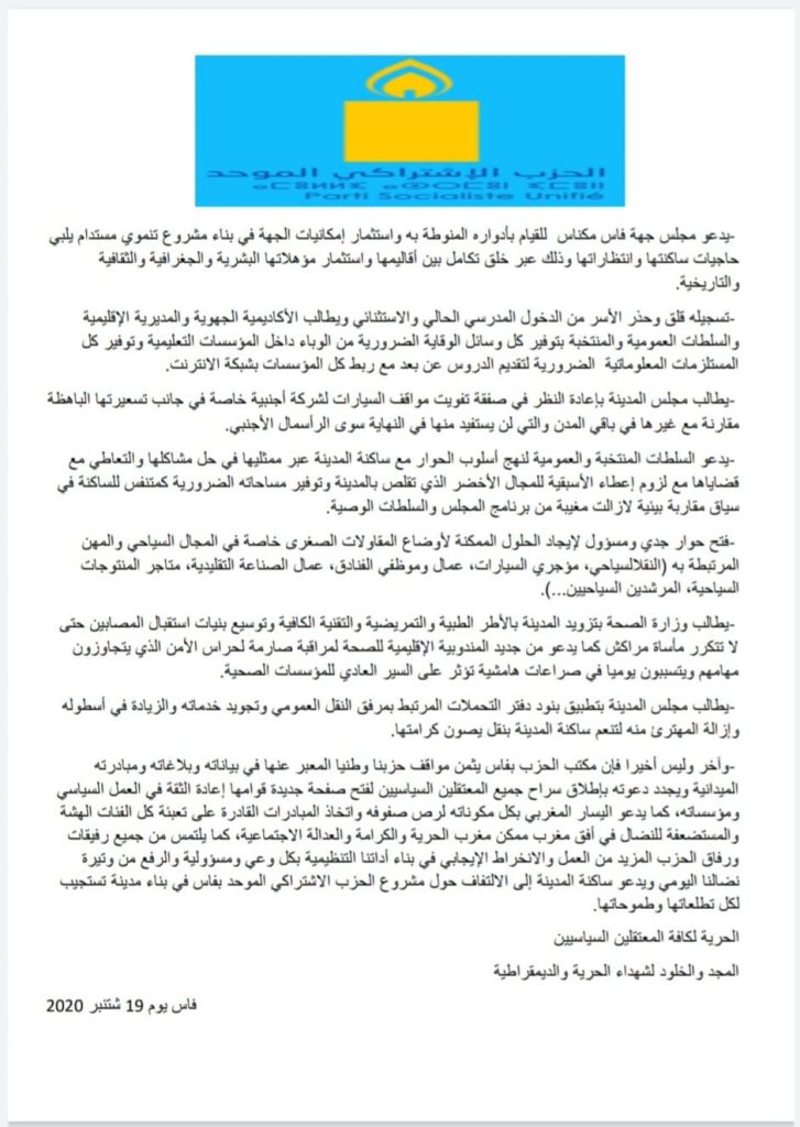 - وآخر وليس أخيرا فإن مكتب الحزب بفاس يثمن مواقف حزبنا وطنيا المعبر عنها في بياناته وبلاغاته ومبادرته الميدانية ويجدد دعوته بإطلاق سراح جميع المعتقلين السياسيين لفتح صفحة جديدة قوامها إعادة الثقة في العمل السياسي ومؤسساته، كما يدعو اليسار المغربي بكل مكوناته لرص صفوفه واتخاذ المبادرات القادرة على تعبئة كل الفئات الهشة والمستضعفة للنضال في أفق مغرب ممكن مغرب الحرية والكرامة والعدالة الاجتماعية، كما يلتمس من جميع رفيقات ورفاق الحزب المزيد من العمل والانخراط الإيجابي في بناء أداتنا التنظيمية بكل وعي ومسؤولية والرفع من وتيرة نضالنا اليومي ويدعو ساكنة المدينة إلى الالتفاف حول مشروع الحزب الاشتراكي الموحد بفاس في بناء مدينة تستجيب لكل تطلعاتها وطموحاتها.