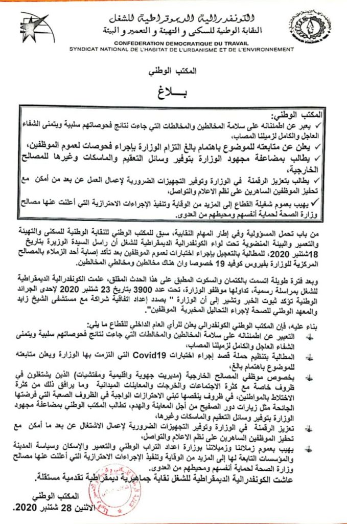 راسل المكتب الوطني للنقابة الوطنية للسكنى والتهيئة والتعمير والبيئة المنضوية تحت لواء الكونفدرالية الديمقراطية للشغل؛ السيدة الوزيرة بتاريخ شتنبر 2020، للمطالبة بالتعجيل بإجراء اختبارات لعموم الموظفين بعد تأكد إصابة أحد زملاء بالمصالح المركزية للوزارة بفيروس كوفيد 19 خصوصا وان هناك مخالطين ومخالطي المخالطين.
