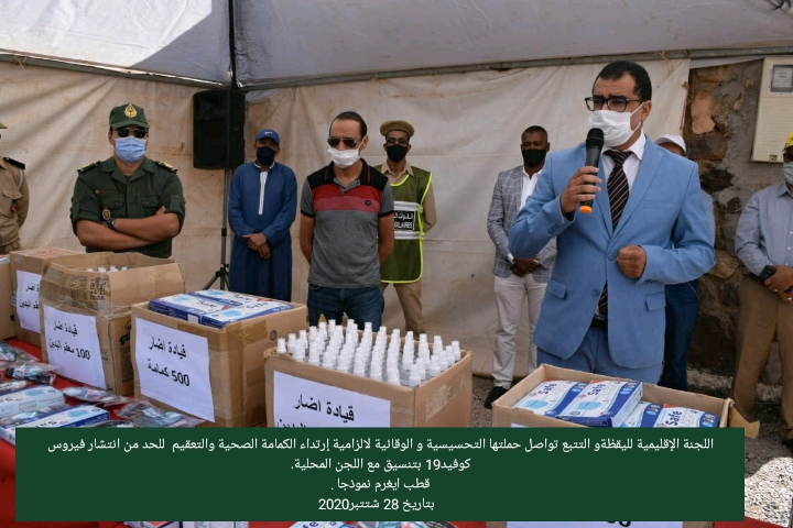 كما انها في تنسيق دائم مع اللجن المحلية لتوسيع قاعدة الحملات التحسيسية و التوجيهية عبر تراب الاقليم وبالمناطق الجبلية و السهلية بهدف خلق دينامية متكاملة، تسعى الى جعل الوقاية سلوكا الزاميا وضروريا لدى الساكنة وإعمال التآزر والتكافل للتقليص من حدة هذا الوباء حفاظا على سلامتهم و ارواحهم، دون إغفال كل المبادرات الانسانية التي واكبت تدبير مراحل تطورات هذه الجائحة المستعصية، بشن حملات الزامية لارتداء الكمامات و توفيرها مجانا لفائدة المعوزين، خاصة المصنوعة من الثوب القابل لاعادة الاستعمال، ناهيكم عن استمرار عمليات التزويد بالماء الصالح للشرب، بواسطة صهاريج متنقلة والتي بلغت الكمية الموزعة الى حدود اليوم 307357متر مكعب استفاد منها 117830 نسمة من ساكنة مختلف الدواوير ،بالاضافة الى تعميق بعض الآبار وتجهيزها بالمستلزمات الأساسية، لفائدة ساكنة العالم القروي المتضررة، من توالي سنوات الجفاف. الشيء الذي لقي ارتياحا لدى الساكنةو تجاوبا ايجابيا لا مشروط بكل وعي وحس وطني لكسب رهان هذا التحدي العصيب استجابة للنداء الوطني الذي دعى اليه عاهل البلاد صاحب الجلالة الملك محمد السادس نصره الله وأيده.
