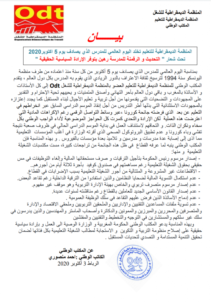 باسم المنظمة الديمقراطية للتعليم Odt.. أحمد المنصوري يصدر بيانا بمناسبة اليوم العالمي للمدرس