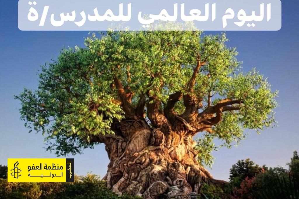 ومنظمة العفو الدولية، وهي تحتفل باليوم العالمي للمدرسات والمدرسين، تغتنم هذه الفرصة لتشيد بالمجهودات الكبيرة والأدوار الريادية للأطر الإدارية والتربوية لتأمين الحق في التعليم للجميع وإعادة فتح المدارس وضمان سدّ الثغرات التعليمية بالرغم من المخاطر والتحديات الجمة التي تواجه قيامهم بمهامهم التربوية.