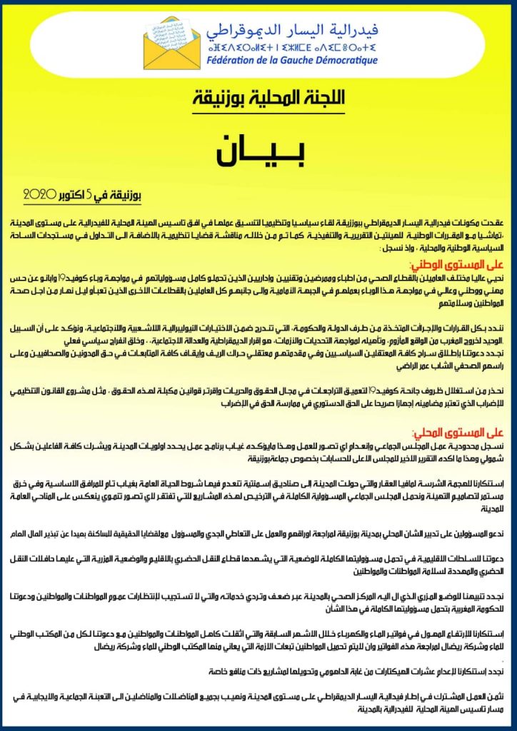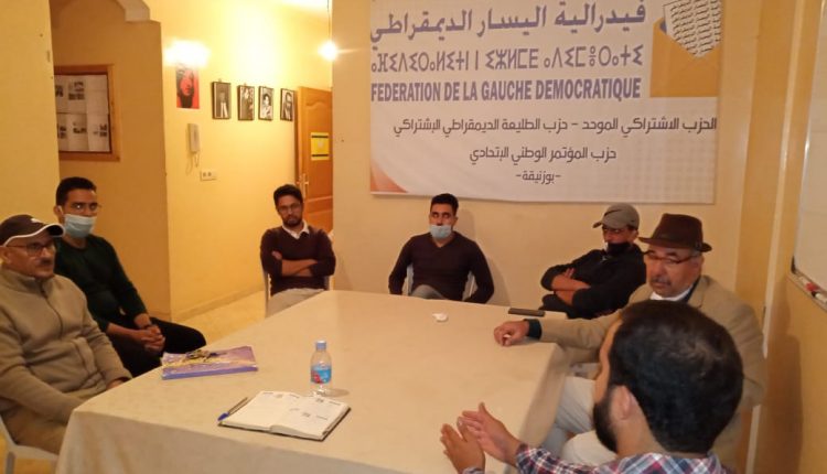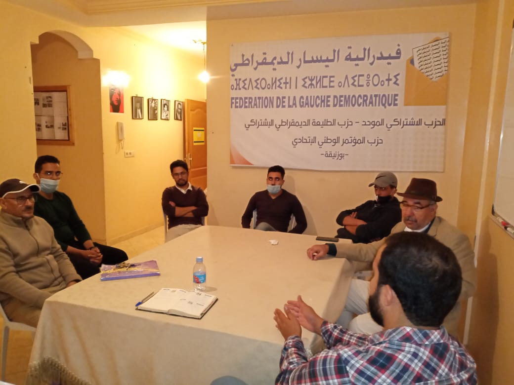 ألتأم أعضاء اللجنة المحلية لفدرالية اليسار الديمقراطي ببوزنيقة مساء يوم 5 أكتوبر 2020 في إطار لقاء سياسي وتنظيمي لتنسيق عملهم في افق تاسيس الهيئة المحلية للفيدرالية على مستوى المدينة،تماشيا مع المقررات الوطنية للهيئتين التقريرية والتنفيذية. كما تم من خلاله مناقشة قضايا تنظيمية بالاضافة الى التداول في مستجدات الساحة السياسية الوطنية والمحلية.