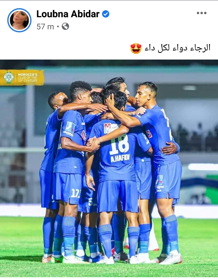 عبرت لبنى أبيدار في تدوينة على صفحتها الرسمية عبر الفايسبوك عن فرحتها بالفوز الذي حققه نادي الرجاء الرياضي ضد اولمبيك خريبكة لحساب الجولة التاسعة والعشرين من البطولة المغربية .
