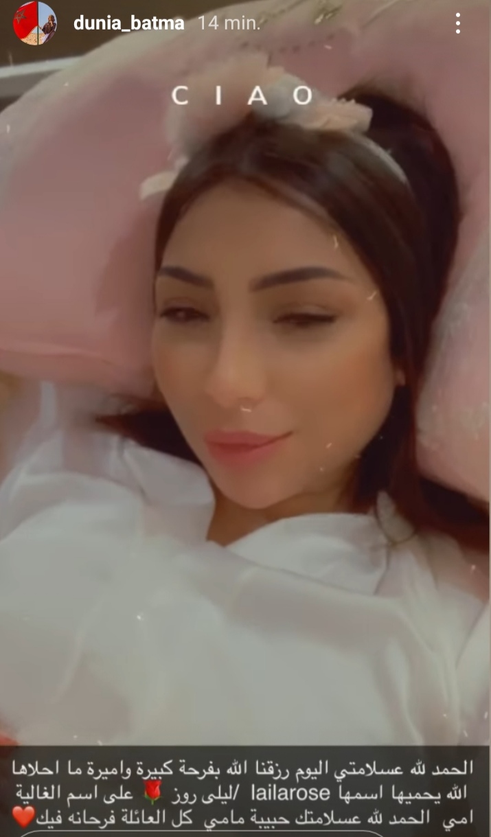 رزقت الفنانة المغربية دنيا بطمة ، امس السبت بطفلة و أعلنت الخبر من خلال زوجها المنتج محمد الترك ، حيث طمئنت جمهورها عن حالتها الصحية، بنشرها فيديو على انستغرام ، و كشفت فيه اسم المولد الجديد “ليلى روز ” في اول خروج لها بعد الولادة .