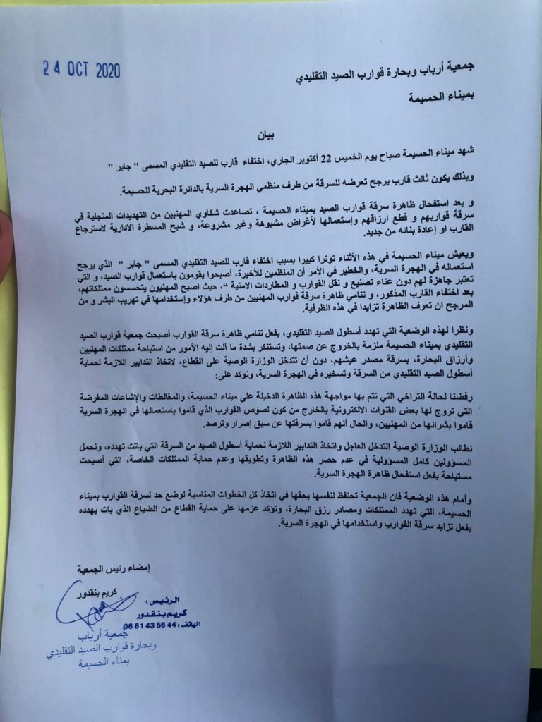 ونظرا لهذه الوضعية التي تهدد أسطول الصيد التقليدي، بفعل تنامي ظاهرة سرقة القوارب أصبحت جمعية قوارب الصيد التقليدي بميناء الحسيمة ملزمة بالخروج عن صمتها، وتستنكر بشدة ما آلت إليه الأمور من استباحة ممتلكات المهنيين وأرزاق البحارة، بسرقة مصدر عيشهم، دون أن تتدخل الوزارة الوصيةعلى القطاع، لاتخاذ التدابير اللازمة لحماية أسطول الصيد التقليدي من السرقة وتسخيره في الهجرة السرية، ونؤكد على: