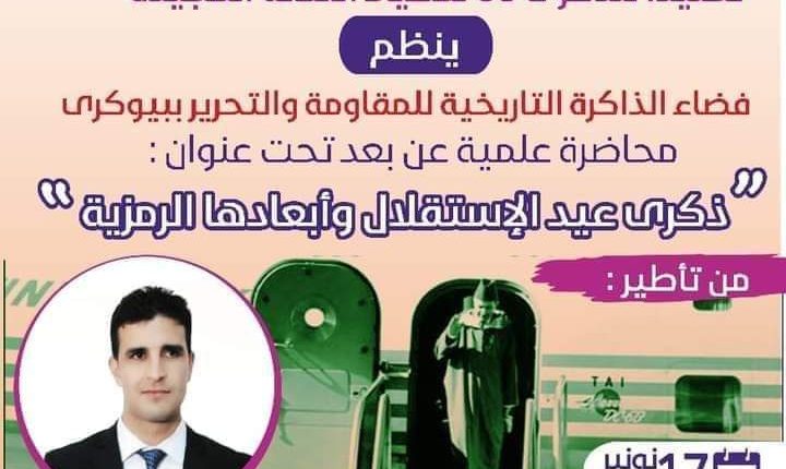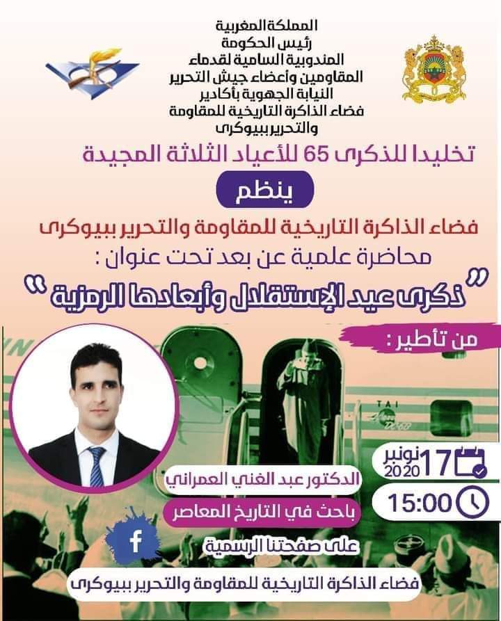 احتفالا بالذكرى الخامسة والستين لعيد الاستقلال المجيد والتي تصادف يوم 18 نونبر من كل سنة نظم فضاء الذاكرة التاريخية للمقاومة والتحرير ببيوكرى يوم امس 17نونبر 2020. محاضرة علمية تاريخية