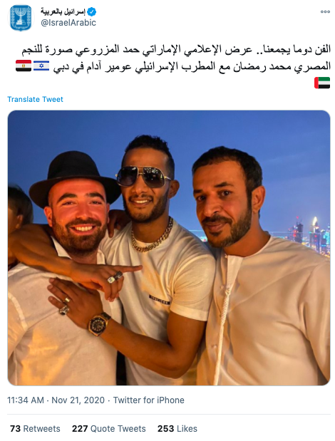 وظهر في الصورة رمضان بصحبة المرزوعي والمطرب الإسرائيلي عومير آدام، الذي علق على الصورة كاتبا: “أشهر فنان في مصر مع أشهر فنان في إسرائيل، دبي تجمعنا”.