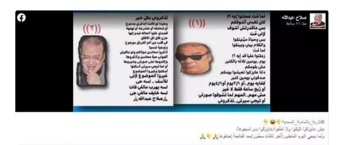 وأضاف: “المهم لما تشوفوا صورتي أو تيجي سيرتي.. تذكروني.. تذكروني بكل خير.. وحبذا لو كانت الذكرى بدموع.. أو شحتفة أو حشرجة أو نهنهة.. قصدي خلوا الحالة تبدو إنها.. حزن فاق كل الآفاق.. في قلب من ألم الفراق موجوع واعوا تنسوا اذكروا محاسن موتاكم ولو مفيش.. ألفولي حبة محاسن واذكروها.. واكتبوها على صورتي وشيروها”.