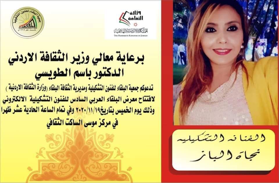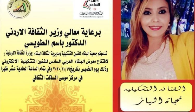اعلنت الفنانة التشكيلية العالمية نجاة الباز عن مشاركتها بملتقى البلقاء العربي السادس للفنون التشكيلية الإلكتروني وذالك في مركز موسى الساكت الثقافي في الأردن من تنظيم الفنان نذير عوامله وبرعاية وزير الثقافة الأردني الدكتور باسم الطوسي.