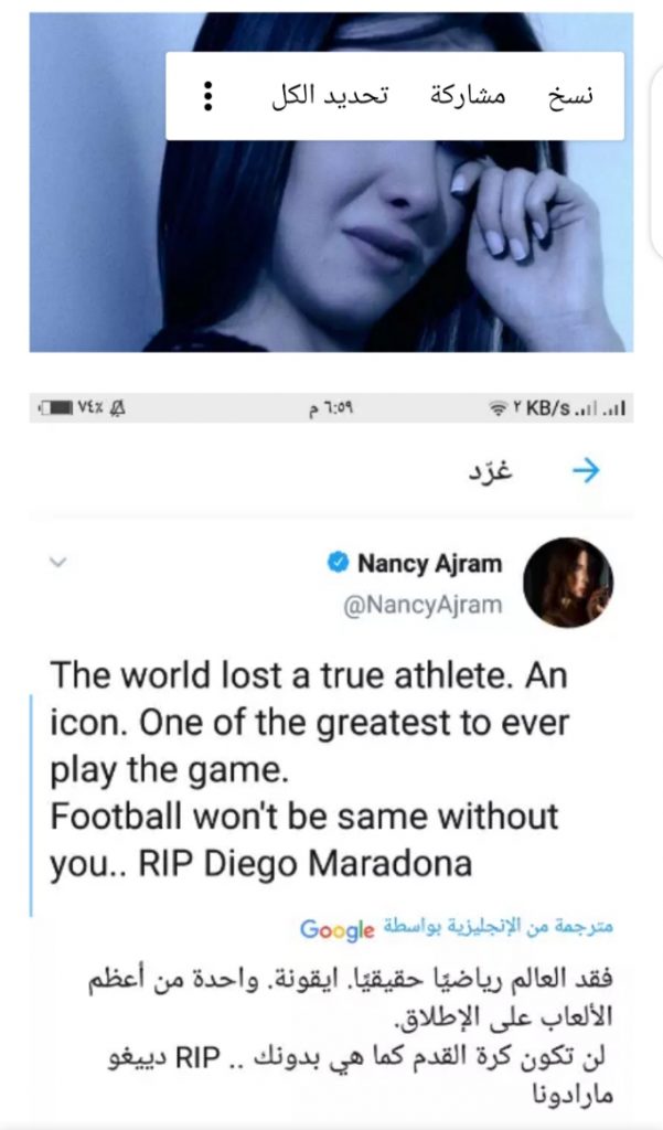 وتباري نجوم العالم لرثاء مارادونا ، وكان من بين النجوم الذين قاموا برثاء الاسطورة الارجنتينية النجمة اللبنانية “نانسي عجرم ” وذلك من خلال حسابها الرسمي على موقع تويتر ، حيث عبرت عن حزنها البالغ لوفاة ماردونا ، وقالت ان العالم فقد رياضيًا حقيقيًا في واحدة من أكثر الألعاب شعبية ، وهي كرة القدم ، وأن كرة القدم بعد رحيله لن تكون كما كانت في وجوده.