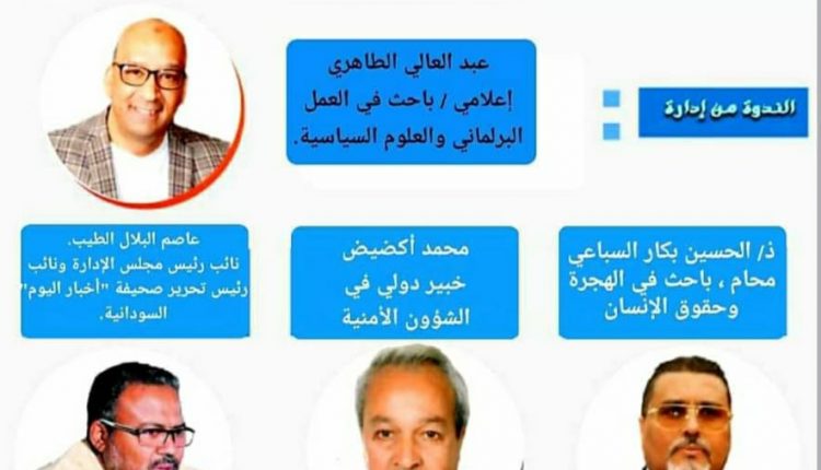 هذه الندوة الدولية التي أطرها كل من الأستاذ الحسين بكار السباعي المحامي بهيئة أگادير العيون والباحث في قضايا الهجرة وحقوق الإنسان، والأستاذ محمد أكضيض الخبير الدولي في الشؤون الأمنية، وأشرف على إدارتها الأستاذ عبدالعالي الطاهري الإعلامي والباحث في العمل البرلماني والعلوم السياسية، وقد تعذَّر على الإعلامي الكبير الأستاذ عاصم البلال الطيب حضور فعاليات هذه الندوة الدولية لظروف طارئة، كما كان مُبرمجاً له، وهو الذي يشغل مهام نائب رئيس مجلس الإدارة ونائب رئيس تحرير صحيفة « أخبار اليوم » السودانية.