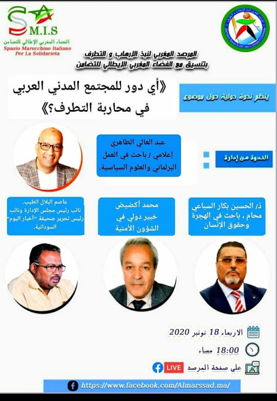 ” المرصد المغربي لنبذ الإرهاب والتطرف” و “الفضاء المغربي الإيطالي للتضامن”، ندوة دولية، تحت عنوان : » أي دور للمجتمع المدني العربي في مواجهة الإرهاب والتطرف ؟ « ، وذلك يوم الأربعاء 18 نونبر 2018 ، على الساعة السادسة مساء بتوقيت المغرب.