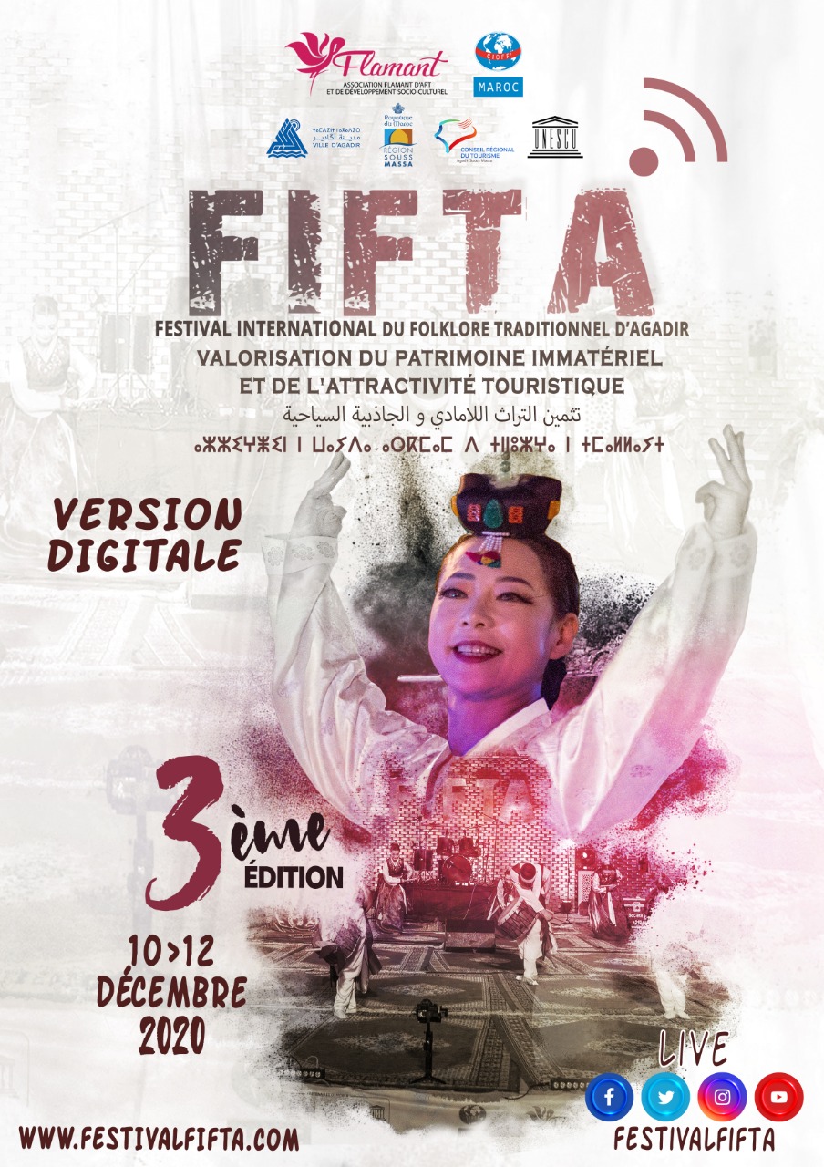 في دورة 100% رقمية ، تنظم جمعية فلامون للفن و التنمية السوسيوثقافية ومنظمة cioff/Unesco المغرب وبتنسيق مع جماعة أكادير ، مجلس جهة سوس ماسة و المجلس الجهوي للسياحة بسوس ماسة ، الدورة الثالثة للمهرجان الدولي للفلكلور التقليدي تحت شعار ” تثمين التراث اللامادي والجاذبية السياحية ” وذلك خلال الفترة الممتدة من 10 إلى 12 دجنبر الجاري .