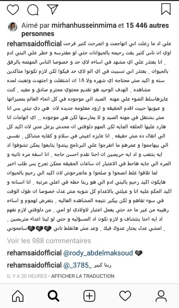 جاء في تعليق ريهام سعيد” على قد ما زعلت إني إتهاجمت كثير فرحت أوي إن ناس كثير بقت رحيمة بالحيوانات حتى لو مفترسة و خطر على البني آدم .
