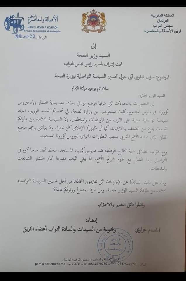 ” إن التطورات والتحولات التي عرفها الوضع الوبائي ببلادنا منذ بداية انتشار الوباء في مارس المنصرم، كانت تستوجب من وزارة الصحة، في شخصكم السيد الوزير، اعتماد سياسة تواصلية مبنية على القرب من المواطنات والمواطنين، إلا السياسة المعتمدة من طرفكم اتسمت بنوع من الضعف والارتباك، كما أن ظهوركم الإعلامي كان نادرا، ولا يتماشى وحجم الوضع المقلق الذي عاشه المجتمع المغربي بسبب التطورات المتواترة لفيروس كورونا المستجد.