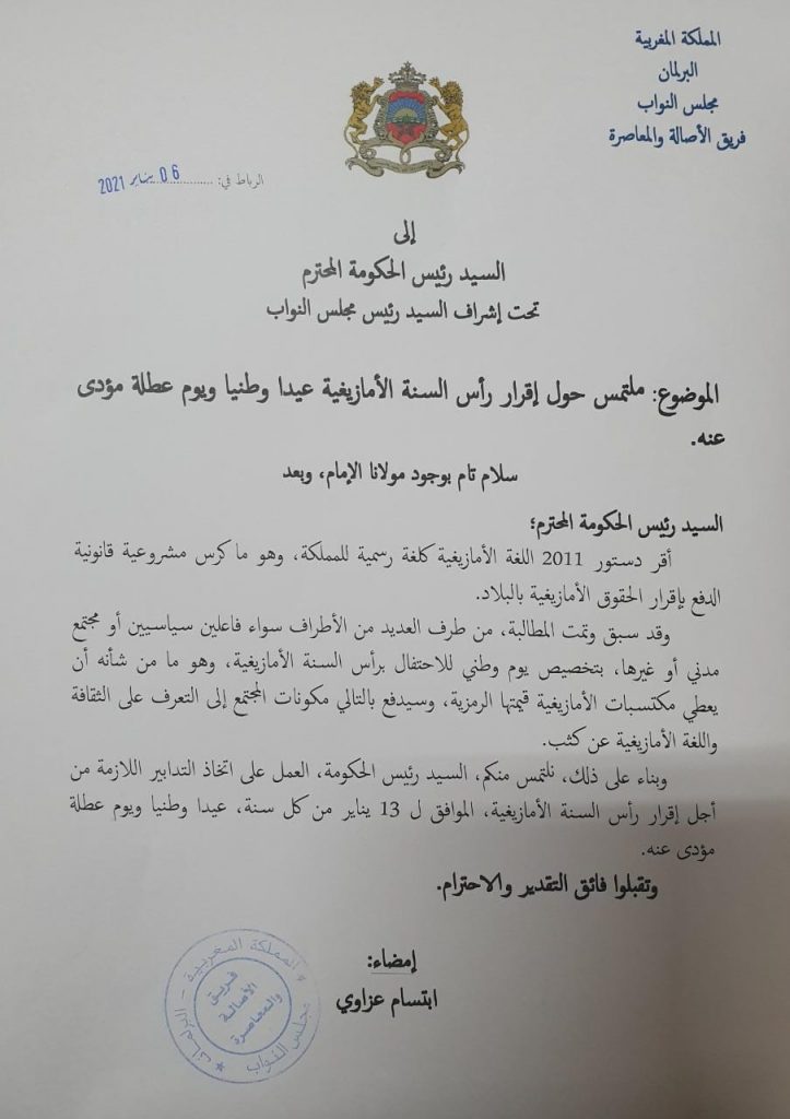 وجهت النائبة البرلمانية الشابة إبتسام عزاوي ملتمس موجها إلى السيد رئيس الحكومة لإقرار رأس السنة الأمازيغية، الموافق ل13 يناير، عيدا وطنيا ويوم عطلة مؤدى عنه.