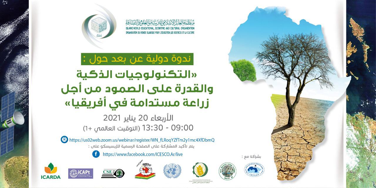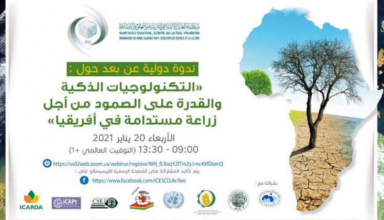 تعقد منظمة العالم الإسلامي للتربية والعلوم والثقافة (إيسيسكو)، غدا الأربعاء (20 يناير 2021)، ندوة دولية حول التكنولوجيات الذكية والقدرة على الصمود من أجل زراعة مستدامة في إفريقيا، وذلك بالتعاون مع حكومة النيجر، والشراكة مع المؤسسة الألمانية للتعاون الدولي، والمنظمة الإسلامية للأمن الغذائي، ومؤسسة التراث الزراعي العالمي، والمركز الدولي لدراسات آسيا والمحيط الهادئ، والمركز الجهوي للاستشعار عن بعد لدول شمال إفريقيا، والمركز الإقليمي الإفريقي لعلوم وتكنولوجيا الفضاء.