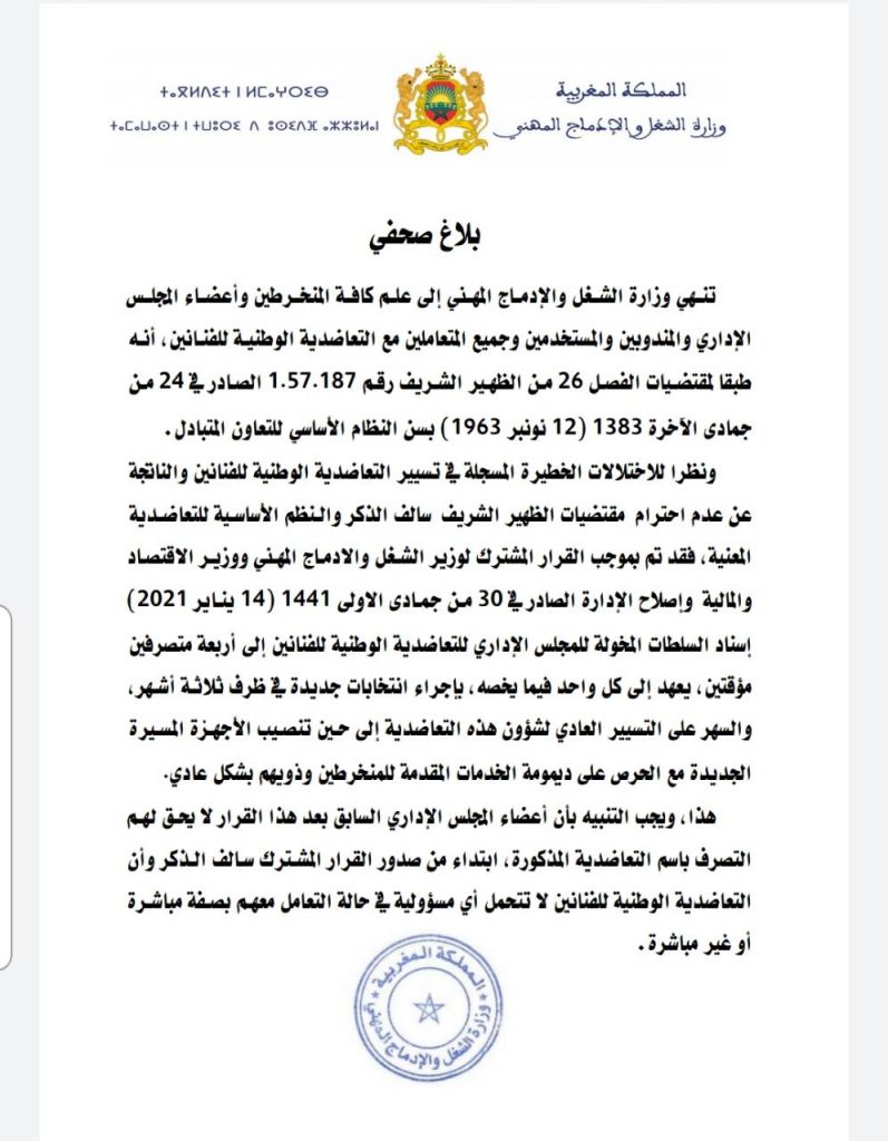 هذا، ويجب التنبيه بأن أعضاء المجلس الإداري السابق بعد هذا القرار لا يحق لهم التصرف باسم التعاضدية المذكورة، ابتداء من صدور القرار المشترك سالف الذكر وأن التعاضدية الوطنية للفنانين لا تتحمل أي مسؤولية في حالة التعامل معهم بصفة مباشرة أو غير مباشرة.