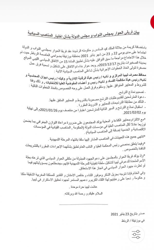 باستضافة كريمة من جلالة الملك محمد السادس و حكومته الرشيدة عقد فريقا الحوار بمجلسي النواب و الدولة اجتماعا على مدى يومي 22 و 23 من شهر يناير 2021 بمنطقة بوزنيقة بضواحي العاصمة الرباط, حيت تم خلال هذا الاجتماع مراجعة ما سبق التوافق عليه بشأن تطبيق المادة 15 من الاتفاق السياسي الليبي الموقع بمدينة الصخيرات بتاريخ 17/12/2015م .وبعد حوار بناء تم الاتفاق على تشكيل و تسمية فرق عمل مصغرة تتولى اتخاذ الخطوات الإجرائية بشأن شاغلي المناصب السيادية الآتية :