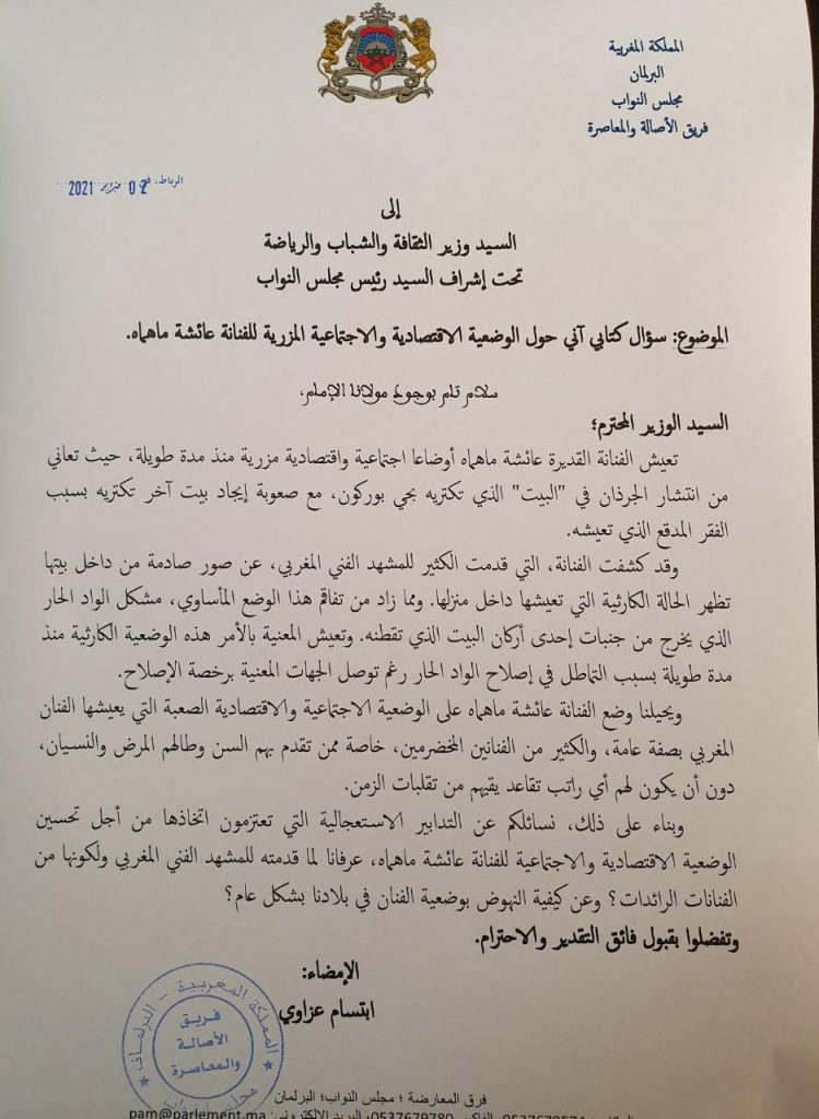 وجهت النائبة البرلمانية الشابة إبتسام عزاوي سؤالا كتابيا موجها إلى السيد وزير الثقافة حول الوضعية الاجتماعية والاقتصادية المزرية التي تعاني منها الفنانة القديرة عائشة ماهماه.