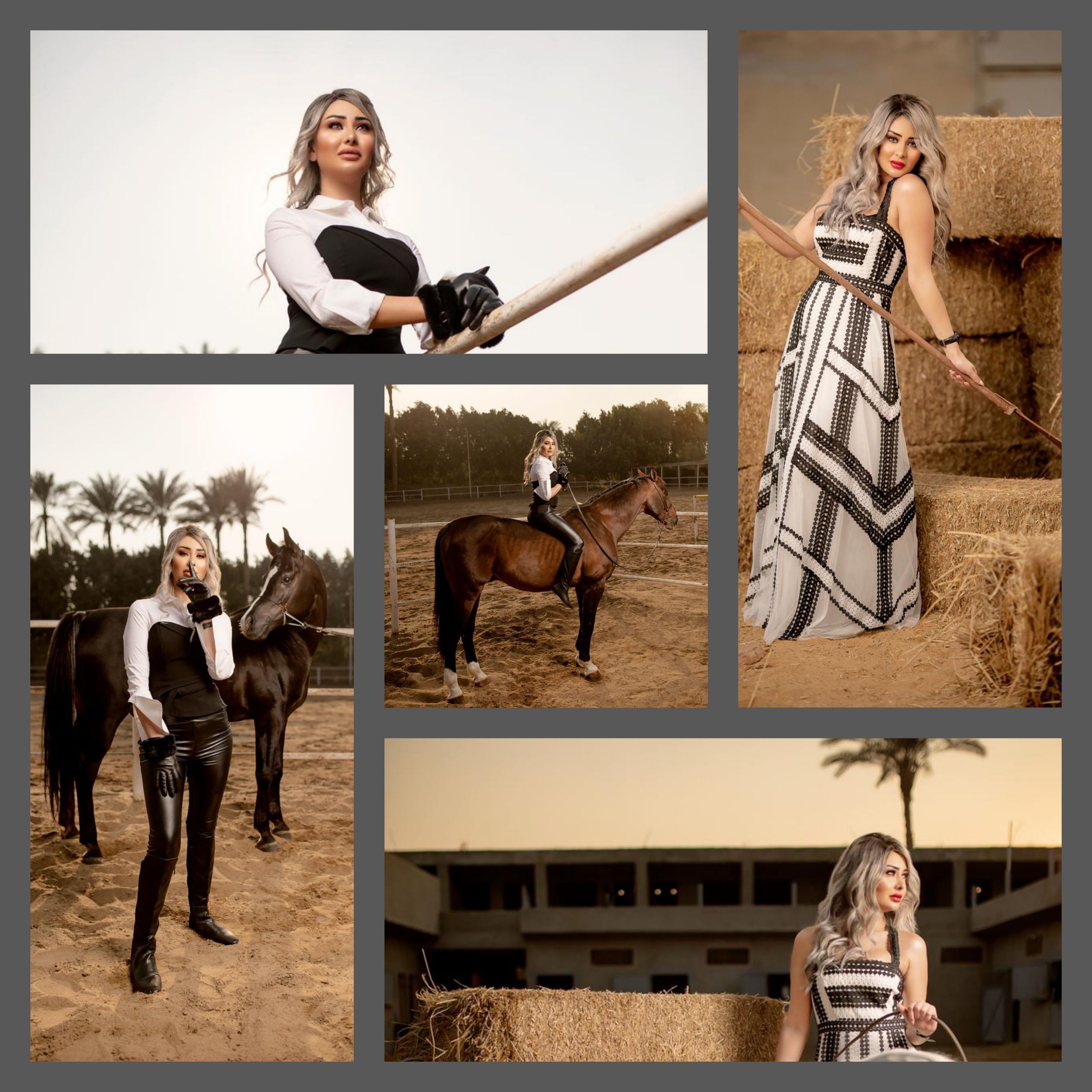 كما خضعت الفنانة نور الكاديكي لجلسة تصوير جديدة، تألقت فيها بلوك جديد مختلف، حيث ظهرت ممتطية حصان لونه اسود، ولون شعر تلجي واختلط اللونان الاسود والابيض في ملابسها ليزيدوها جمالاً، كما بدت رشيقة للغاية.