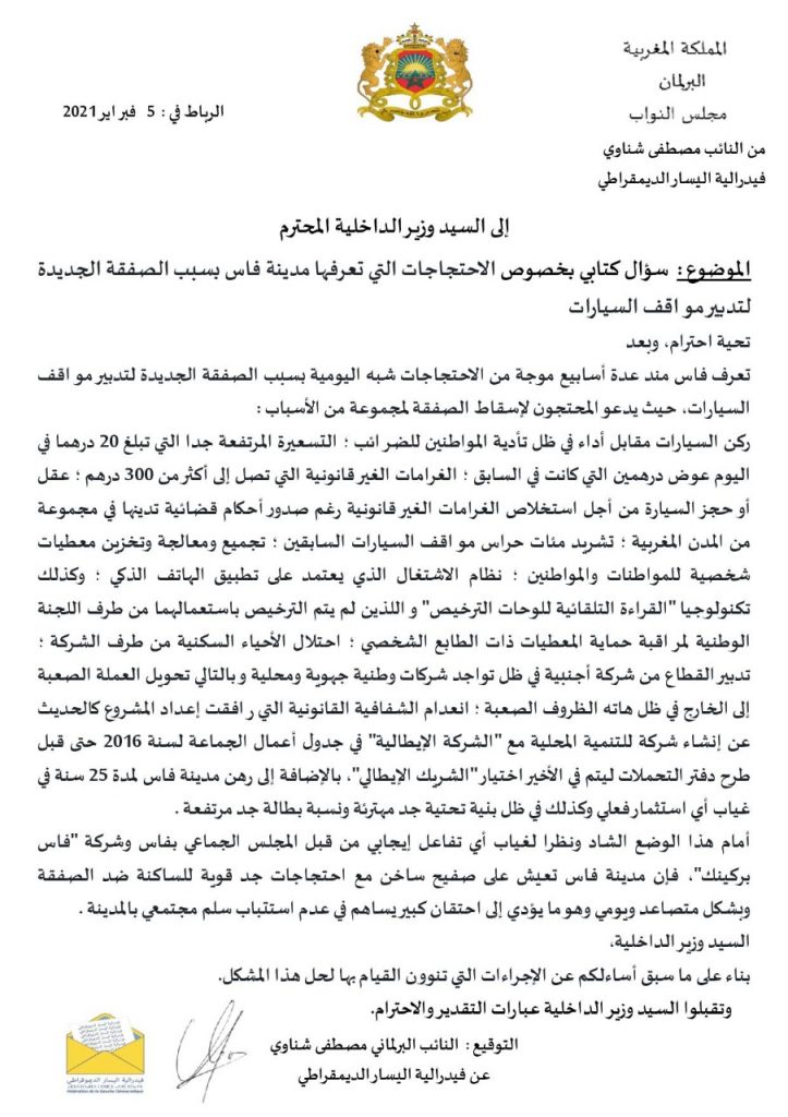 مصطفى الشناوي يوجه سؤالا كتابيا إلى وزير الداخلية بخصوص الاحتجاجات حول الصفقة الجديدة لتدبير مواقف السيارات