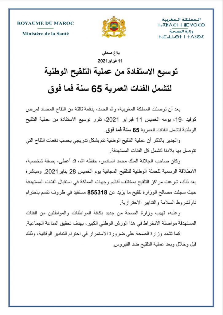 بعد أن توصلت المملكة المغربية، بدفعة ثالثة من اللقاح المضاد لمرض كوفيد -19، يومه الخميس 11 فبراير 2021، تقرر توسيع الاستفادة من عملية التلقيح الوطنية لتشمل الفئات العمرية 65 سنة فما فوق.