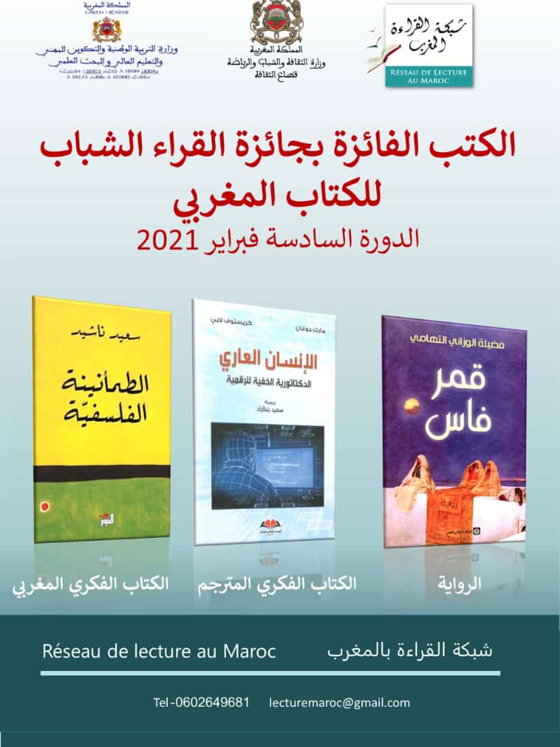 تعلن شبكة القراءة بالمغرب عن الكتب الفائزة بجائزة القراء الشباب للكتاب المغربي برسم دورتها السادسة، لسنة 2021 وقد فاز كتاب «قمر فاس» للكاتبة فضيلة التهامي الوزاني في صنف الرواية وكتاب «الطمأنينة الفلسفية» للكانب سعيد نشيد في صنف الكتاب الفكري المغربي، وكتاب «الإنسان العاري، الديكتاتورية الخفية للرقمية» للكاتبين: مارك دوغان وكريستوف لابي، ترجمة سعيد بنكراد في صنف الكتاب الفكري المترجم. وجرى الإعلان عن النتائج مساء يوم الأحد 14 فبراير 2021 في اختتام أشغال لقاء لجنة التحكيم عن بعد على منصة zoom، الذي نظمته اللجنة التنظيمية للجائزة.
