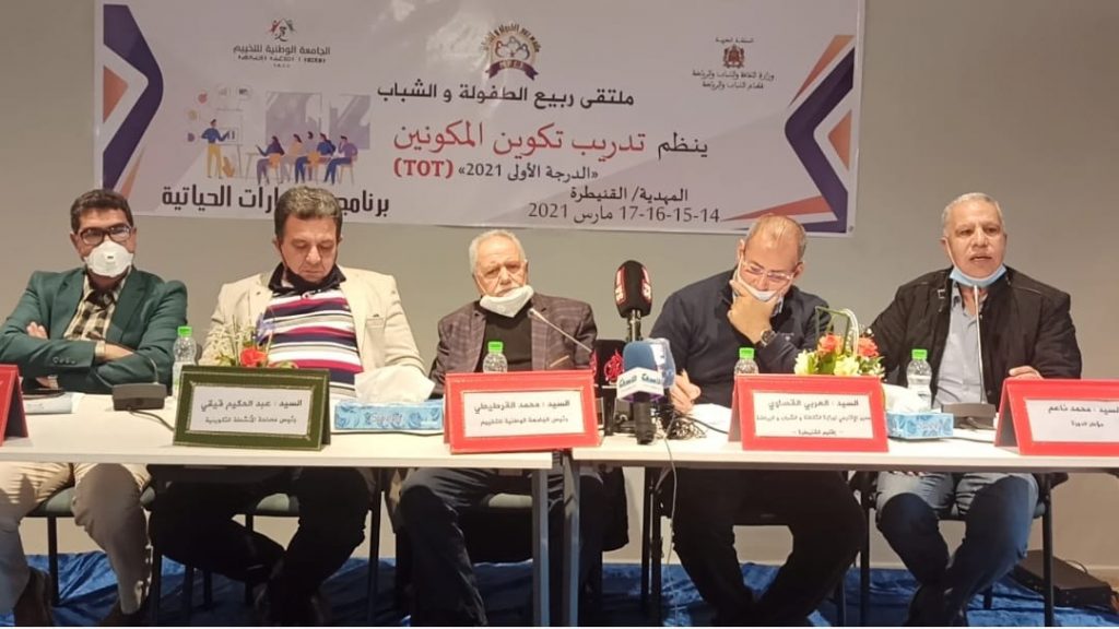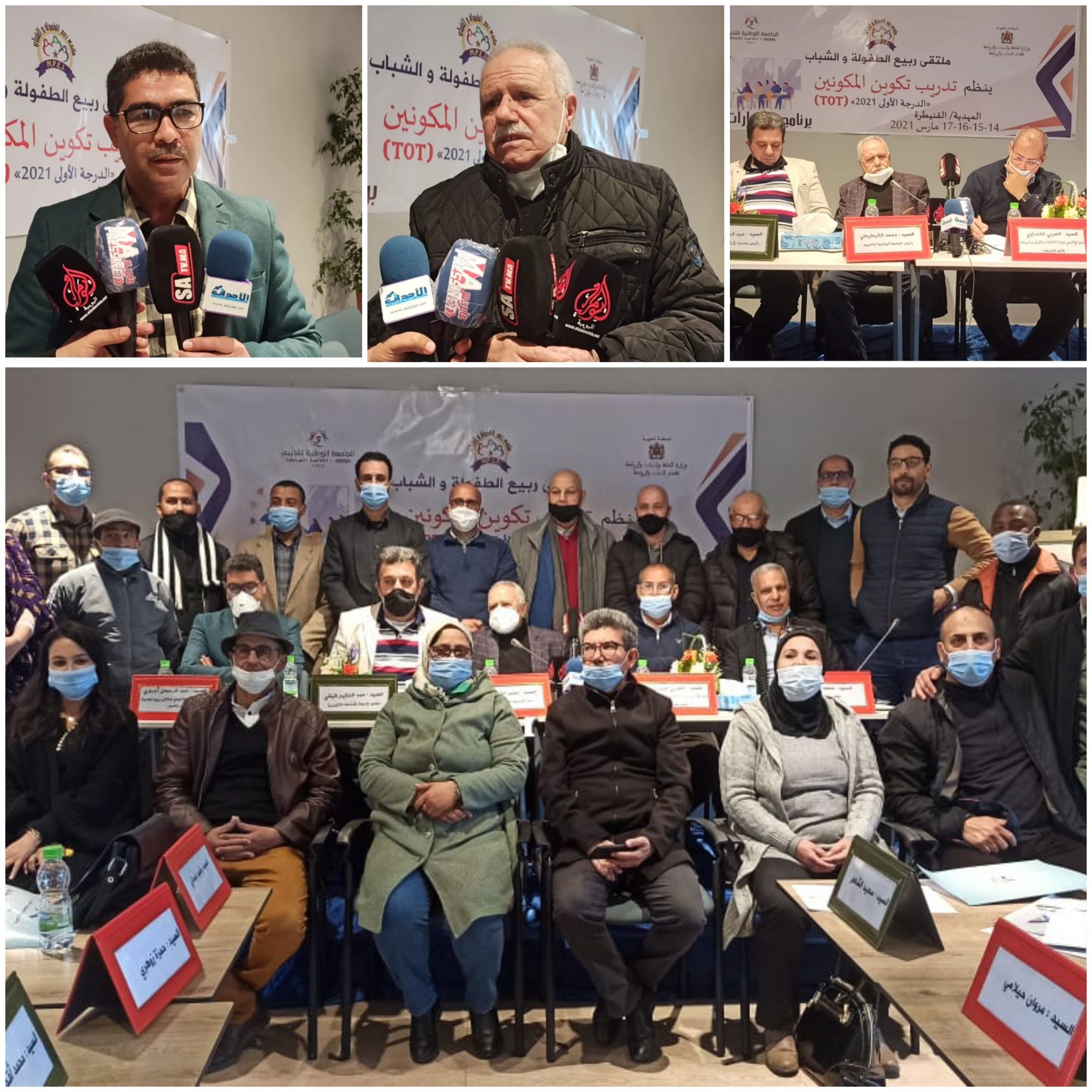 أعطيت أمس الأحد المنصرم ، الموافق ل14 مارس 2021 إنطلاقة تدريب تكوين المكونين، والذي تنظمه جمعية ملتقى ربيع الطفولة والشباب بشراكة مع وزارة الثقافة والشباب والرياضة (قطاع الشباب والرياضة) و الجامعة الوطنية للتخييم، حيث عبر جل المتدخلين في الجلسة الإفتتاحية على أهمية التكوين في مجال الطفولة والشباب، و نوه عبدالرحمن أجباري رئيس جمعية ملتقى ربيع الطفولة والشباب بالأطر المشرفة على هذه الدورة التدريبية.